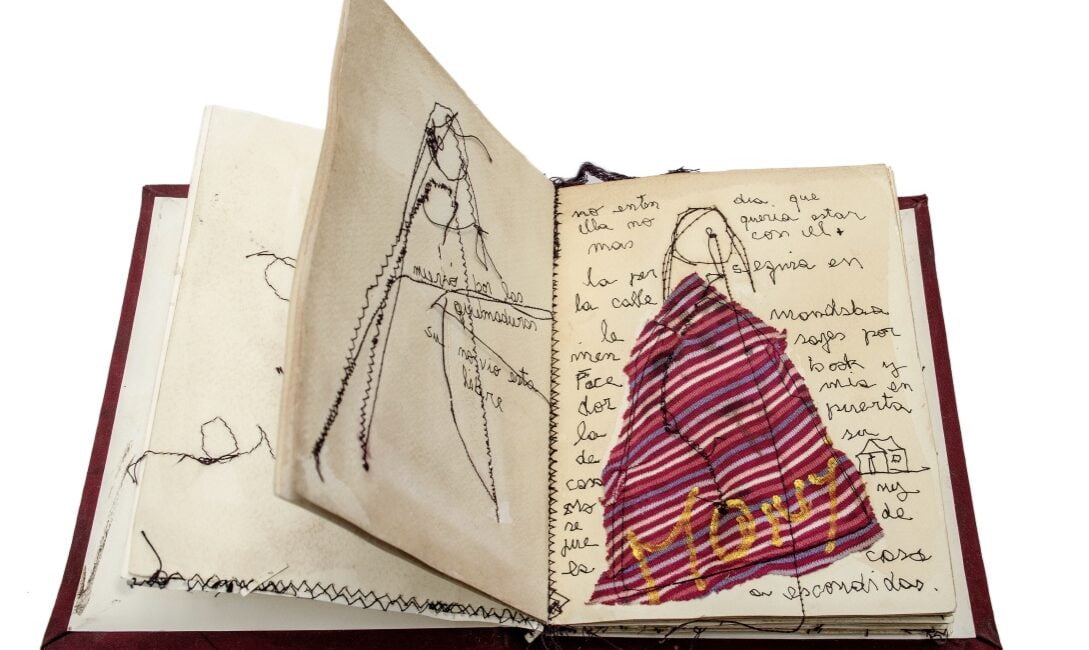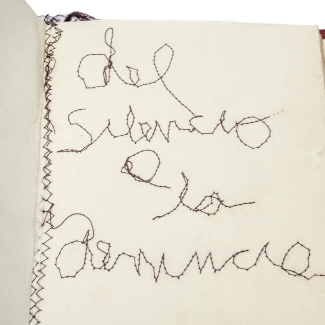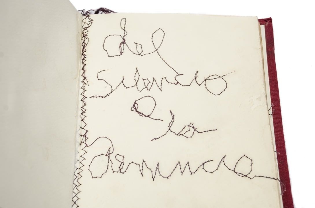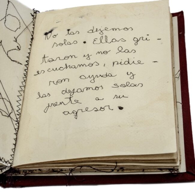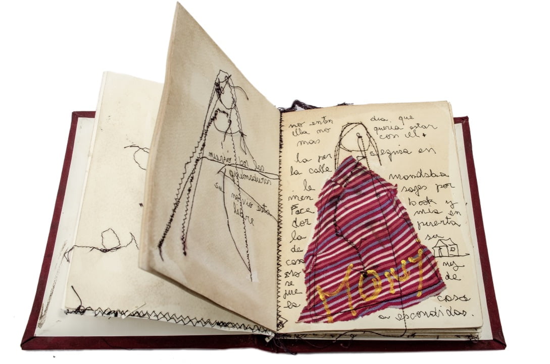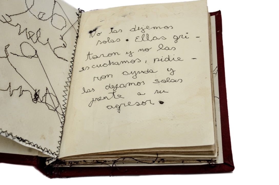 Libro de artista hecho con papel cosido y bordado. Se relevaron notas sobre hechos de violencia y feminicidios en la Argentina publicados durante el año 2011.