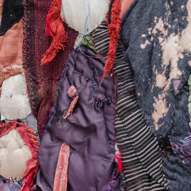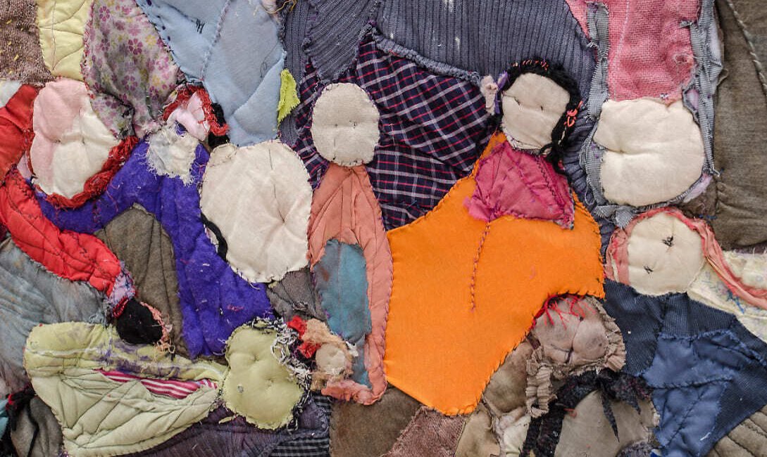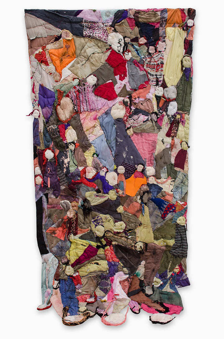 Obra reversible y de montaje variable realizada con retazos juntados el los tachos de basura de los talleres textiles del Barrio de Flores.